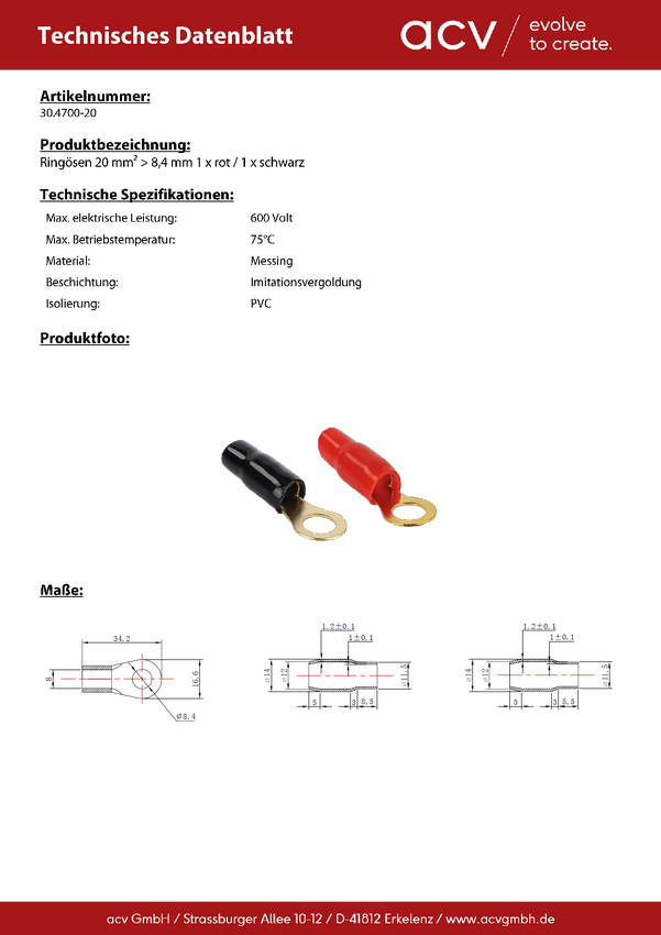 30.4700-20 ACV Złączke oczkowe Car HiFi Zestaw 2-elementowy 20 mm² 8.40 mm czarny, cze...