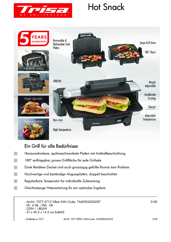 7377.4712 Trisa Hot Snack Elektryczny Grill kontaktowy czarny, srebrny