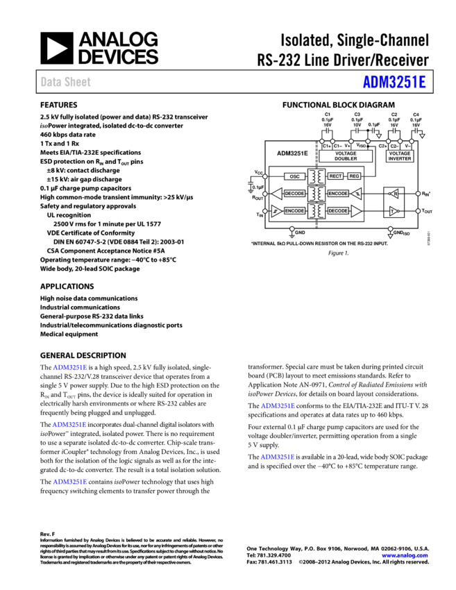 ADM3251E: Isolated Single Channel RS-232 Line Driver/Receiver