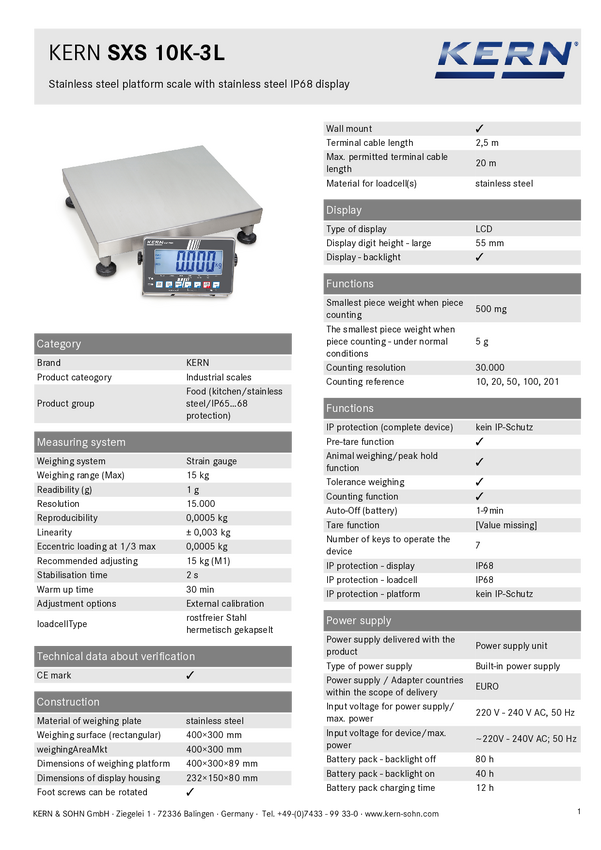 SXS 10K-3L Kern Waga platformowa cyfrowy Zakres pomiaru maks.=15 kg