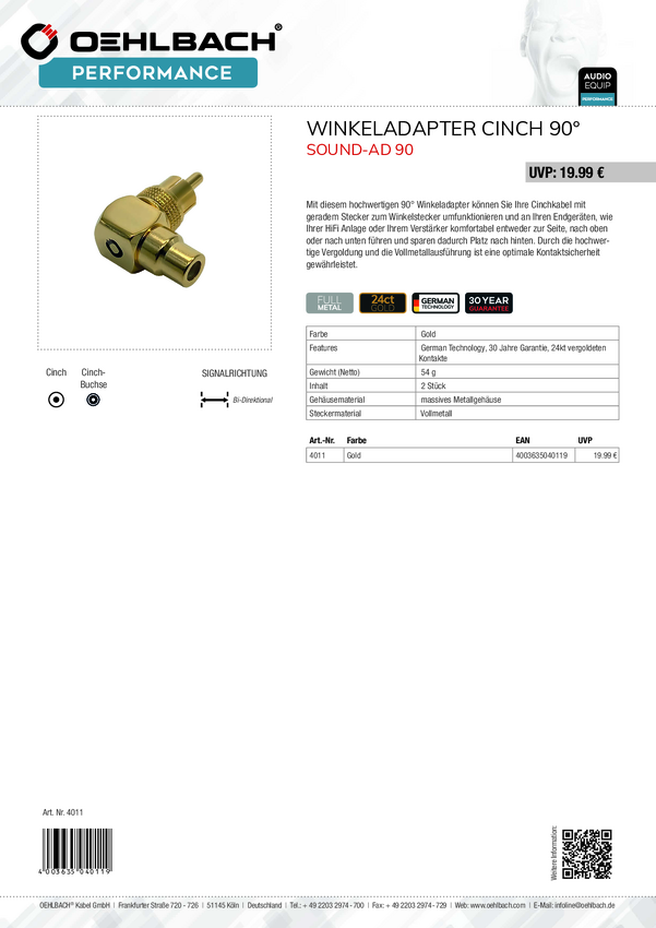 D1C4011 Oehlbach Sound-AD 90 Adapter kątowy cinch [1x złącze męskie RCA/cinch -...