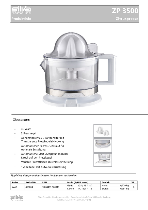 456004 Wyciskarka do cytrusów Silva Homeline ZB 3500, 40 W, ze stopką, stali szlac...