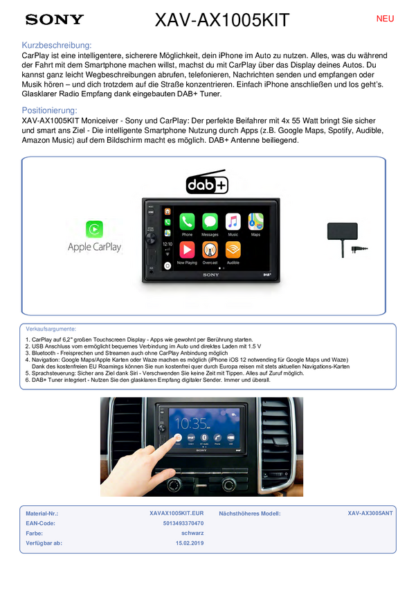 XAVAX1005KIT.EUR Odtwarzacz multimedialny Double Din Sony XAV-AX1005KIT, 4 x 55 W