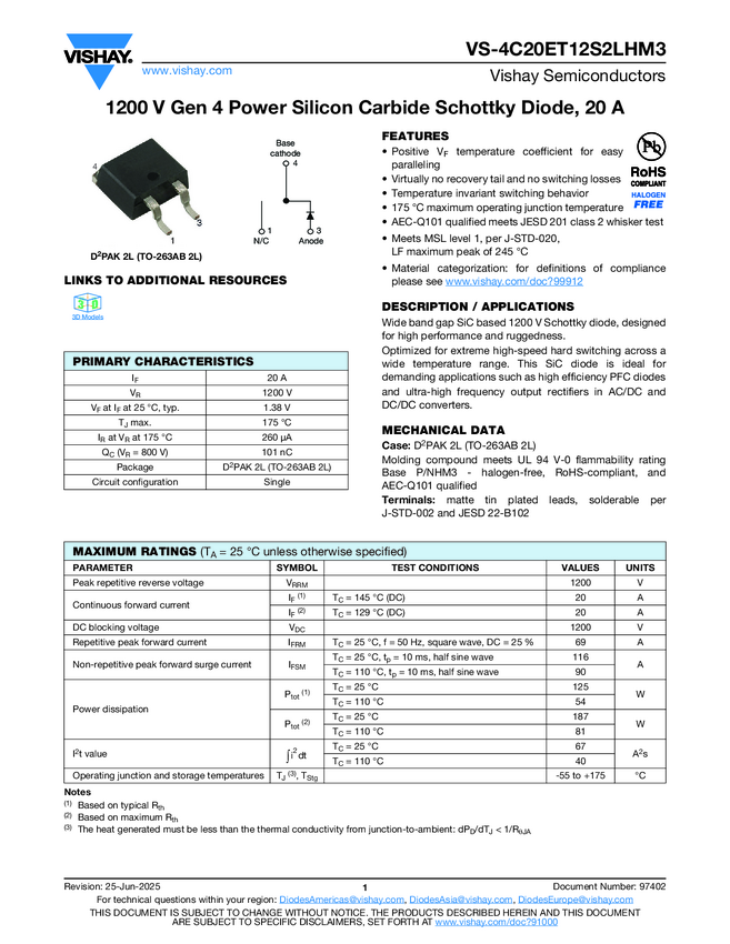 VS-4C20ET12S2LHM3 1200 V Gen 4 Power Silicon Carbide Schottky Diode, 20 A