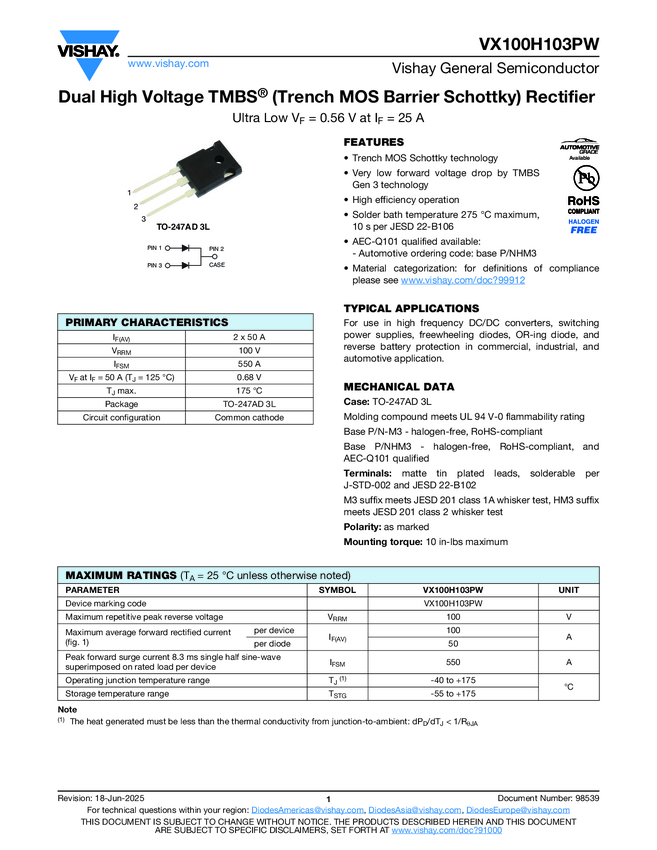 VX100H103PW Dual High Voltage TMBS® (Trench MOS Barrier Schottky) Rectifier Ultra...