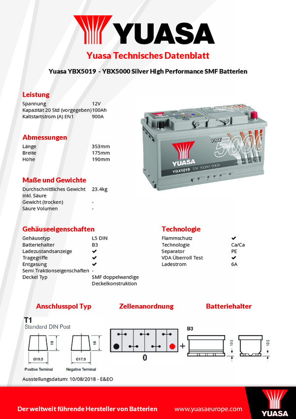 YBX5019 Akumulator samochodowy Yuasa YBX5019 12 V 100 Ah N/A