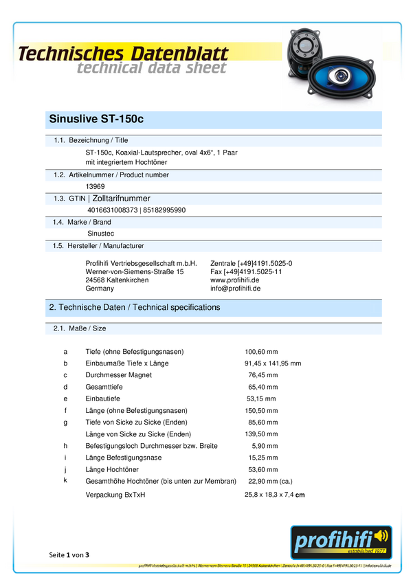 13969 Głośnik samochodowy Sinustec ST-150C, 250 W, 90 dB, 4 Ω, 1 par(a)