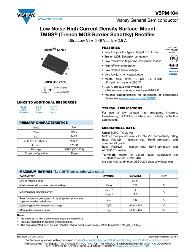 V5PM104 Low Noise High Current Density Surface-Mount TMBS® (Trench MOS Barrier...
