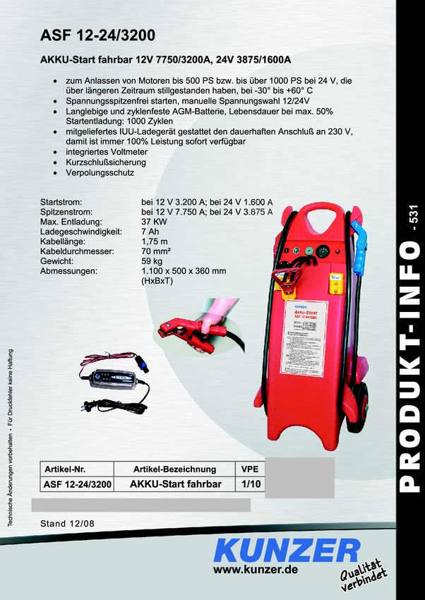 Kunzer Urządzenie rozruchowe ASF 12-24/3200 ASF 12-24/3200 Natężenie rozruchowe przy 12 V=3200 A Natężenie rozruchowe pr