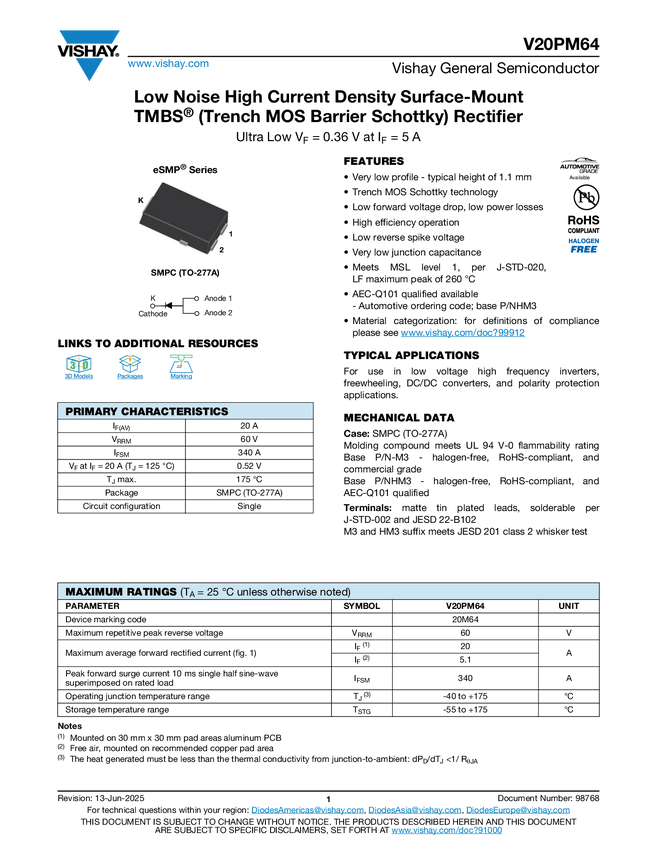 V20PM64 Low Noise High Current Density Surface-Mount TMBS® (Trench MOS Barrier...