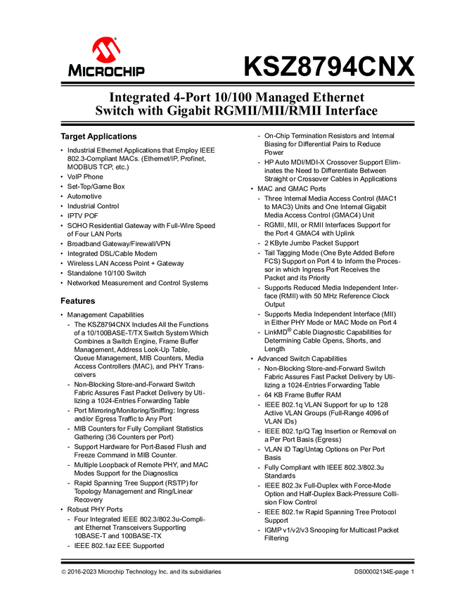 KSZ8794CNX Integrated 4-Port 10/100 Managed Ethernet Switch with Gigabit RGMII/MII/RMII Interface - Data Sheet