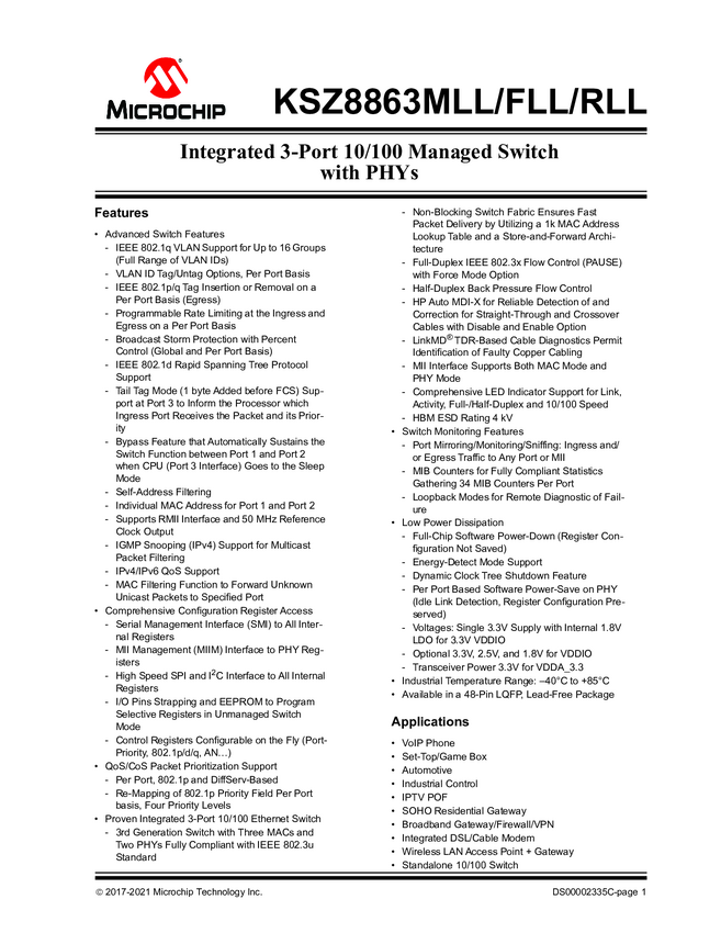 KSZ8863MLL/FLL/RLL Integrated 3-Port 10/100 Managed Switch with PHYs