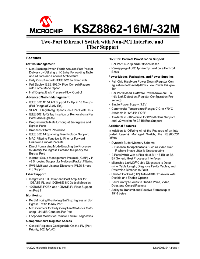 KSZ8862-16/32MQL - 2-Port Ethernet Switch with Non-PCI Interface and Fiber Support