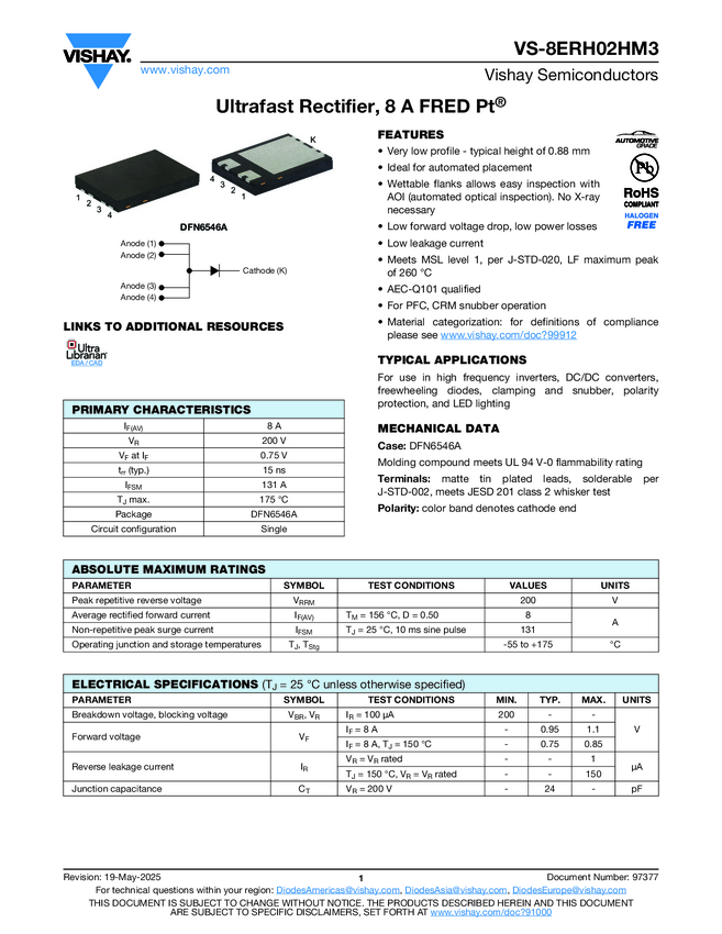 VS-8ERH02HM3 Ultrafast Rectifier, 6 A FRED Pt®