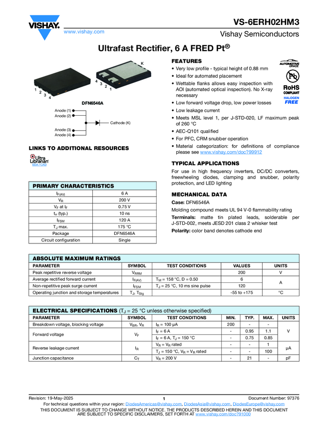 VS-6ERH02HM3 Ultrafast Rectifier, 6 A FRED Pt®