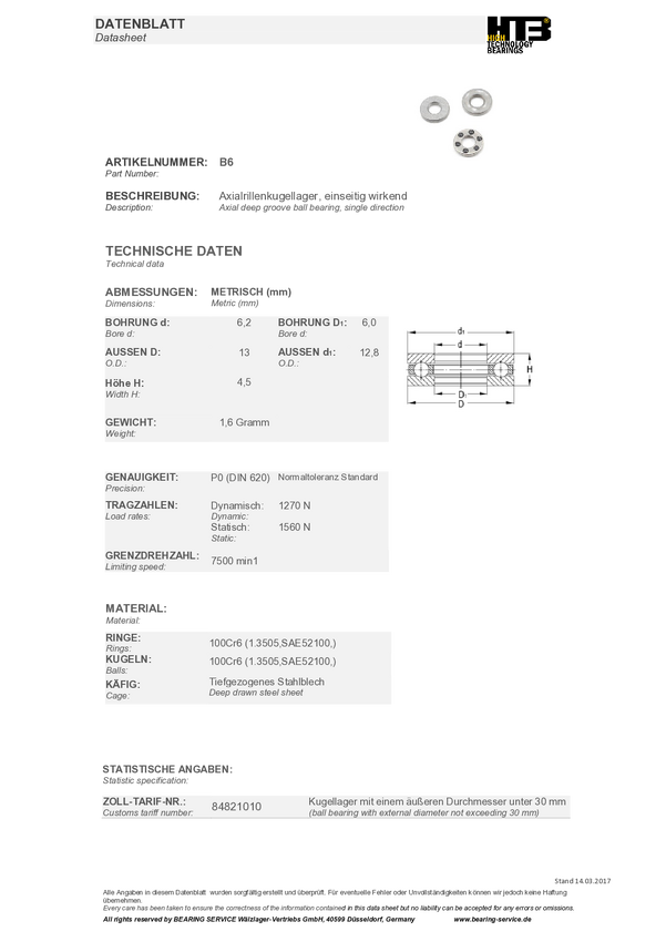 B 6 Łożysko kulkowe wzdłużne Reely B 6, 10000 U/min, 1 szt.