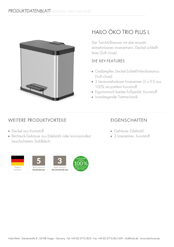 Hailo öko trio plus L 6332000 Kosz na śmieci 27 l stal nierdzewna (S x W x G) 470 x 430 x 340 mm stali szlachetnej Mecha