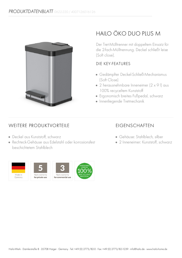 6222200 Hailo Öko duo plus M 6222200 Kosz na śmieci 18 l blacha stalowa (S x W x G)...