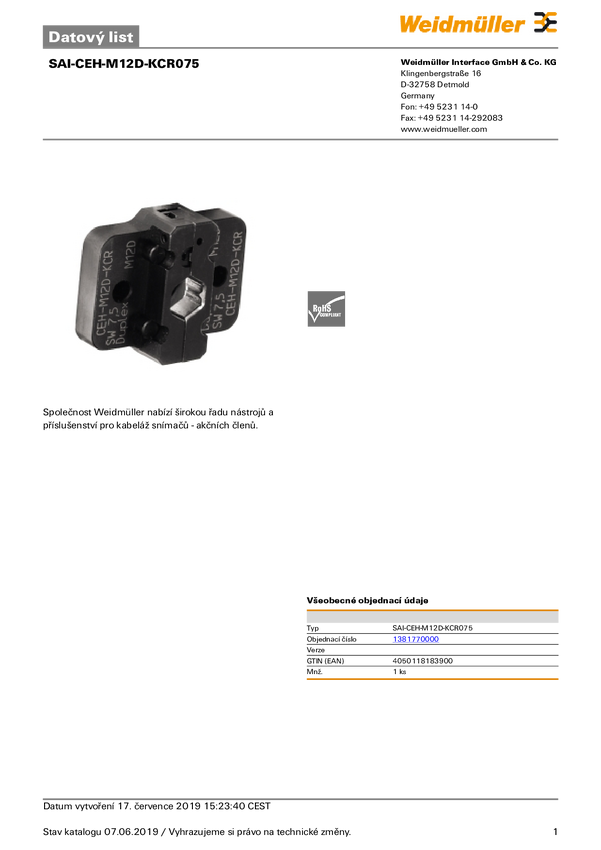1381770000 Weidmüller SAI-CEH-M12D-KCR075 1381770000 Wkładka do zaciskarki złącze czuj...