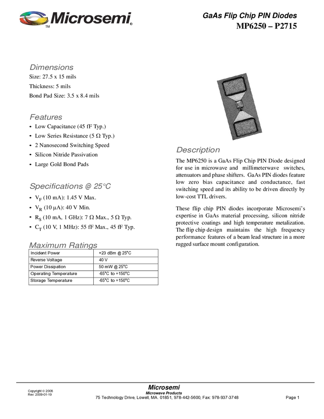 MP6250-P2613-GaAs-Flip-Chip-PIN MP6250-P2715 GaAs Flip Chip PIN Diode Datasheet