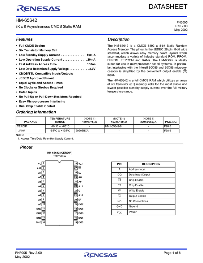 HM-65642/883 8kx8 Asynchronous CMOS Static RAM
