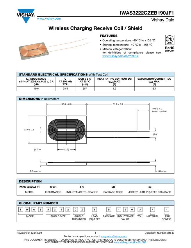 IWAS3222CZEB190JF1 Wireless Charging Receive Coil / Shield