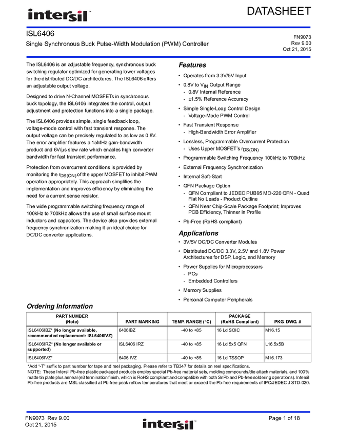 ISL6406 Single Synchronous Buck Pulse-Width Modulation (PWM) Controller