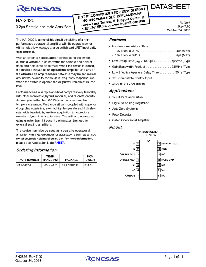 HA-2420/883 3.2 Microsecond Sample and Hold Amplifiers