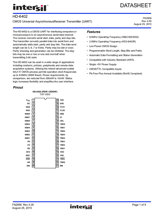 HD-6402 CMOS Universal Asynchronous Receiver Transmitter (UART)