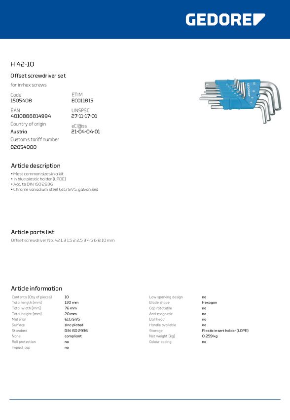 1505408 Zestaw kluczy trzpieniowych Gedore 1505408 1505408 wewnętrzny sześciokąt 10...