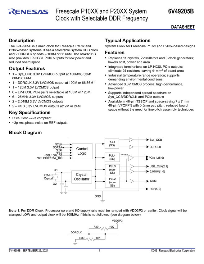 6V49205B Clock Generator for Freescale P1010, P1020, P2020, P2040 Processors