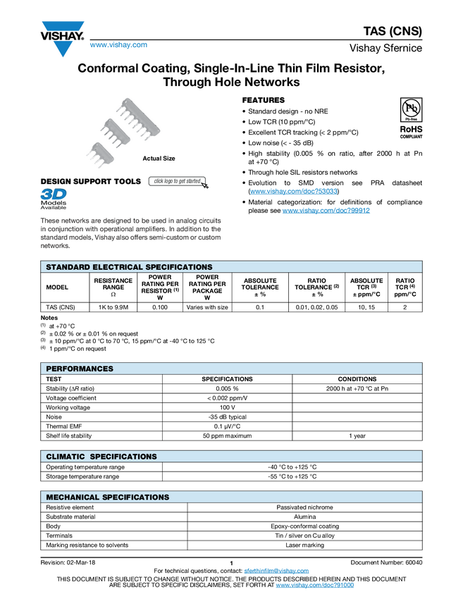 TAS (CNS) Conformal Coating, Single-In-Line Thin Film Resistor, Through Hole Networks