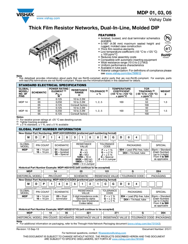 MDP 01 Thick Film Resistor Networks, Dual-In-Line, Molded DIP