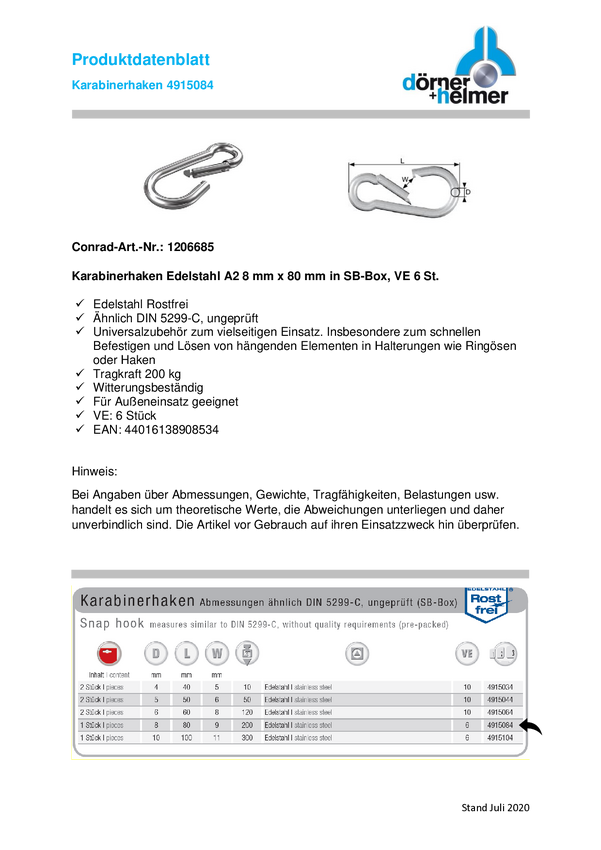 4915084 Karabińczyk dörner + helmer 4915084 (Ø x D) 8 mm x 80 mm