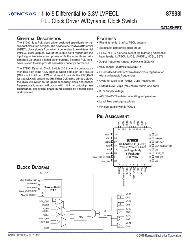 87993I 1-to-5 Differential-to-3.3V LVPECL PLL Clock Driver W/Dynamic Clock Switch