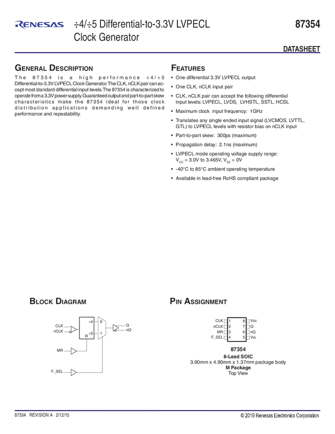 87354I ÷4/÷5 Differential-to-3.3V LVPECL Clock Generator