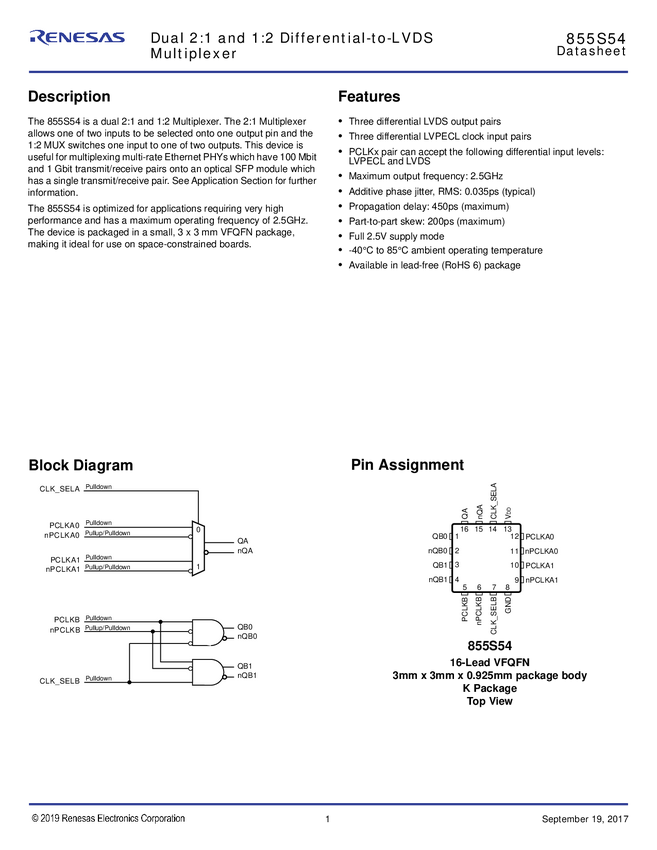 855S54I Dual 2:1 And 1:2 Differential-to-LVDS Multiplexer