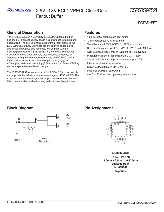 853S9252I 2.5V,3.3V ECL/LVPECL Clock /Data Fanout Buffer