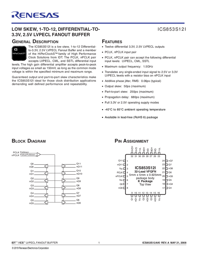 853S12I Low Skew,1-to-12,Differential-to-3.3V,2.5V LVPECL Fanout Buffer