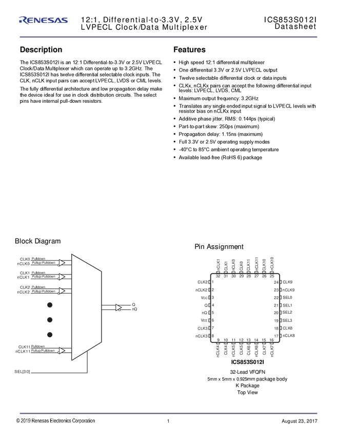 853S012I 12:1 Differential-to-3.3V,2.5V LVPECL Clock/Data Multiplexer