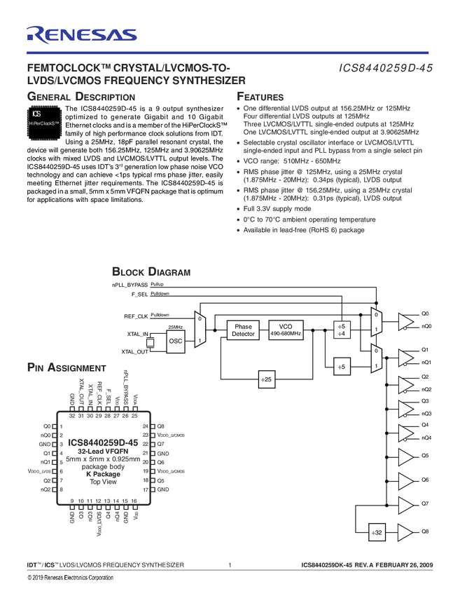 8440259D-45 FemtoClock Crystal/LVCMOS-to-LVDS/LVCMOS Frequency Synthesizer