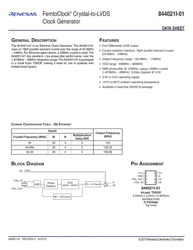 844021I-01 FemtoClock Crystal-to-LVDS Clock Generator