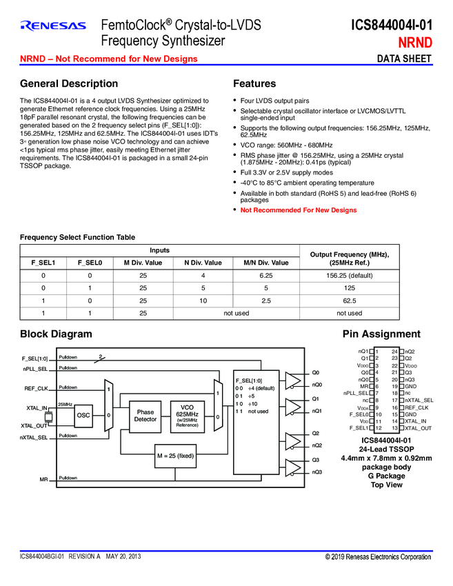 844004I-01 FemtoClock® Crystal-to-LVDS Frequency Synthesizer