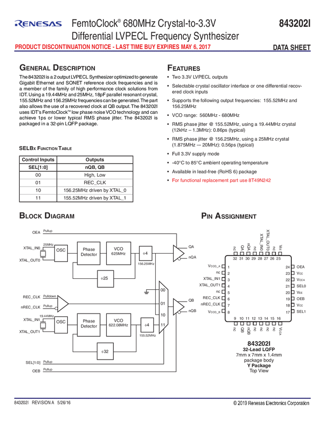 843202I FemtoClock 680MHz, Crystal-to-3.3V Differential LVPECL Frequency Synthesize...