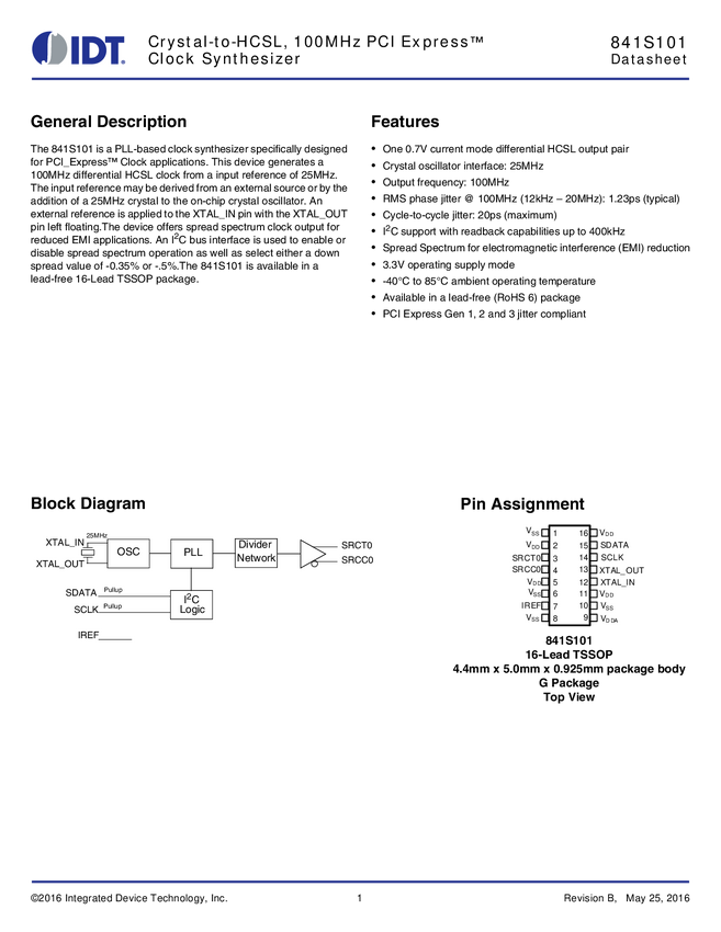 841S101I Crystal-to-HCSL 100MHz PCI Express™ Clock Synthesizer