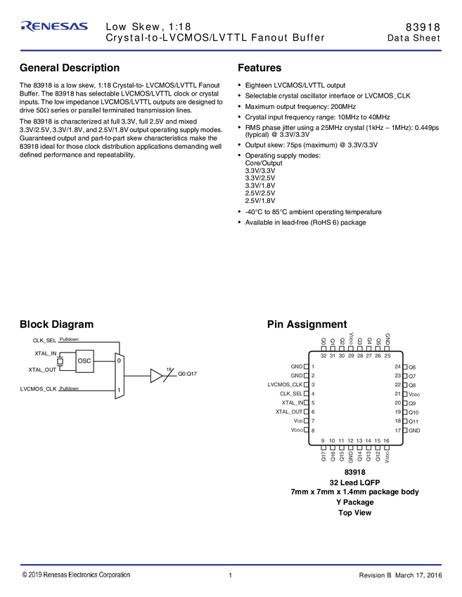 83918I Low Skew,1:18 Crystal-to-LVCMOS/LVTTL Fanout Buffer