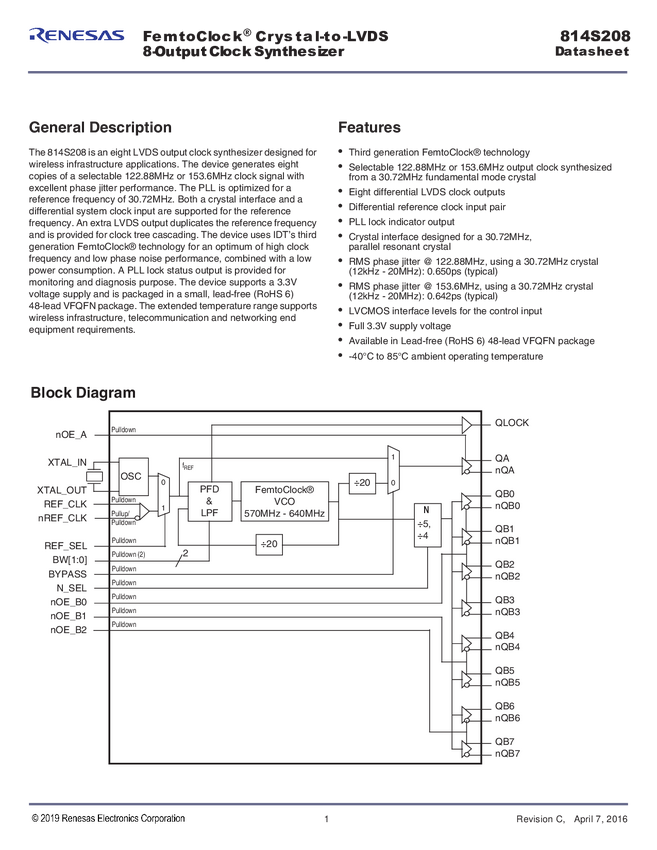 FemtoClock Crystal-to-LVDS 8-Output Clock Synthesizer