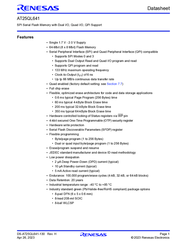 64Mbit, 1.7V Minimum SPI Serial Flash Memory with Dual I/O, Quad I/O and QPI Support