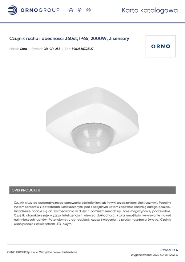 Czujnik ruchu; OR-CR-255; PIR; natynkowy; 230VAC; 2000W; 8A; IP65; 20m; Zakres: 10s-30min; 3...2000lx; biały; 102,5x102,5x58,3mm; 360*; gwarancja: 3 lata; ORNO