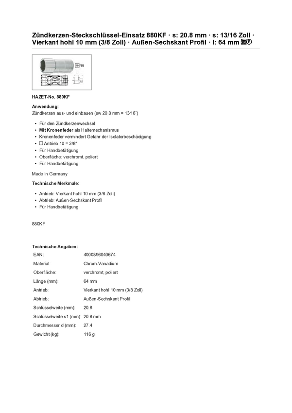 880KF Hazet 880KF zewnętrzny sześciokąt Nasadka do świec zapłonowych 20.8 mm 13&#...